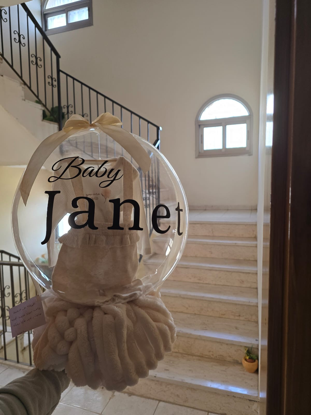 تتكوّن من طقم مواليد ناعم داخل بالون شفاف مكتوب عليه اسم الطفل، على قاعدة مكونه من بوكس وشرشف للأطفال