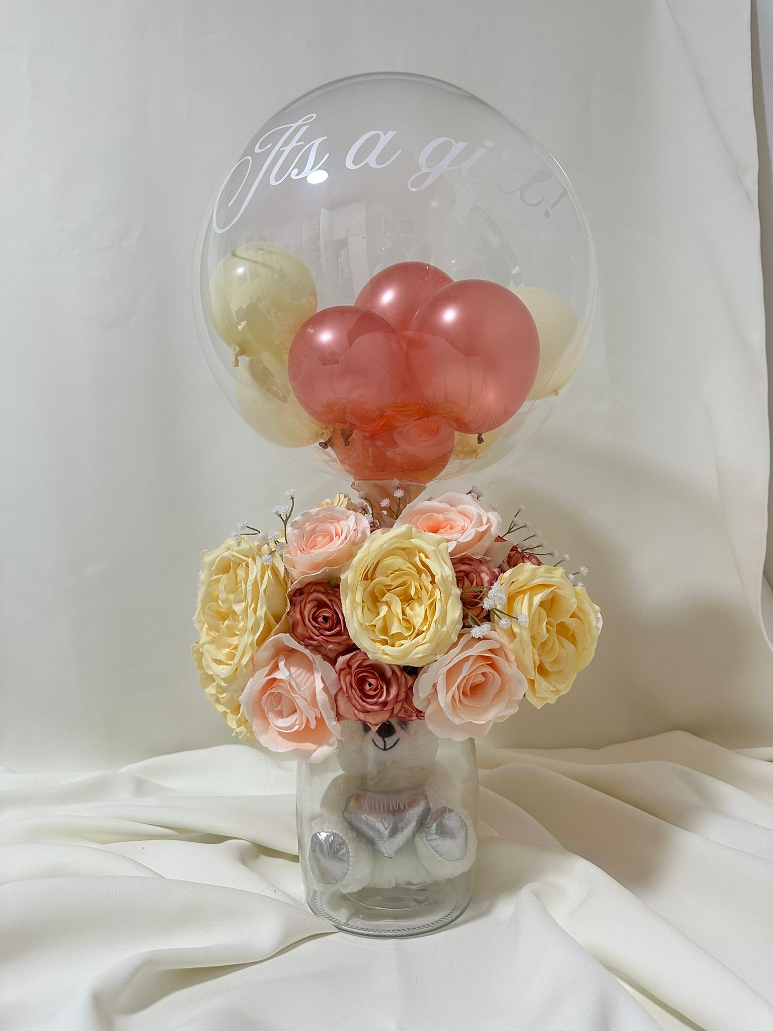 مضمون الهدية: مزهرية قزاز، دبدوب بقلب المزهرية، ورد اصطناعي، بالون شفاف، بالونات صغيرة بقلب البالون الشفاف بالوان ملائمة للون الورد، كتابة حسب اختيارك على البالون