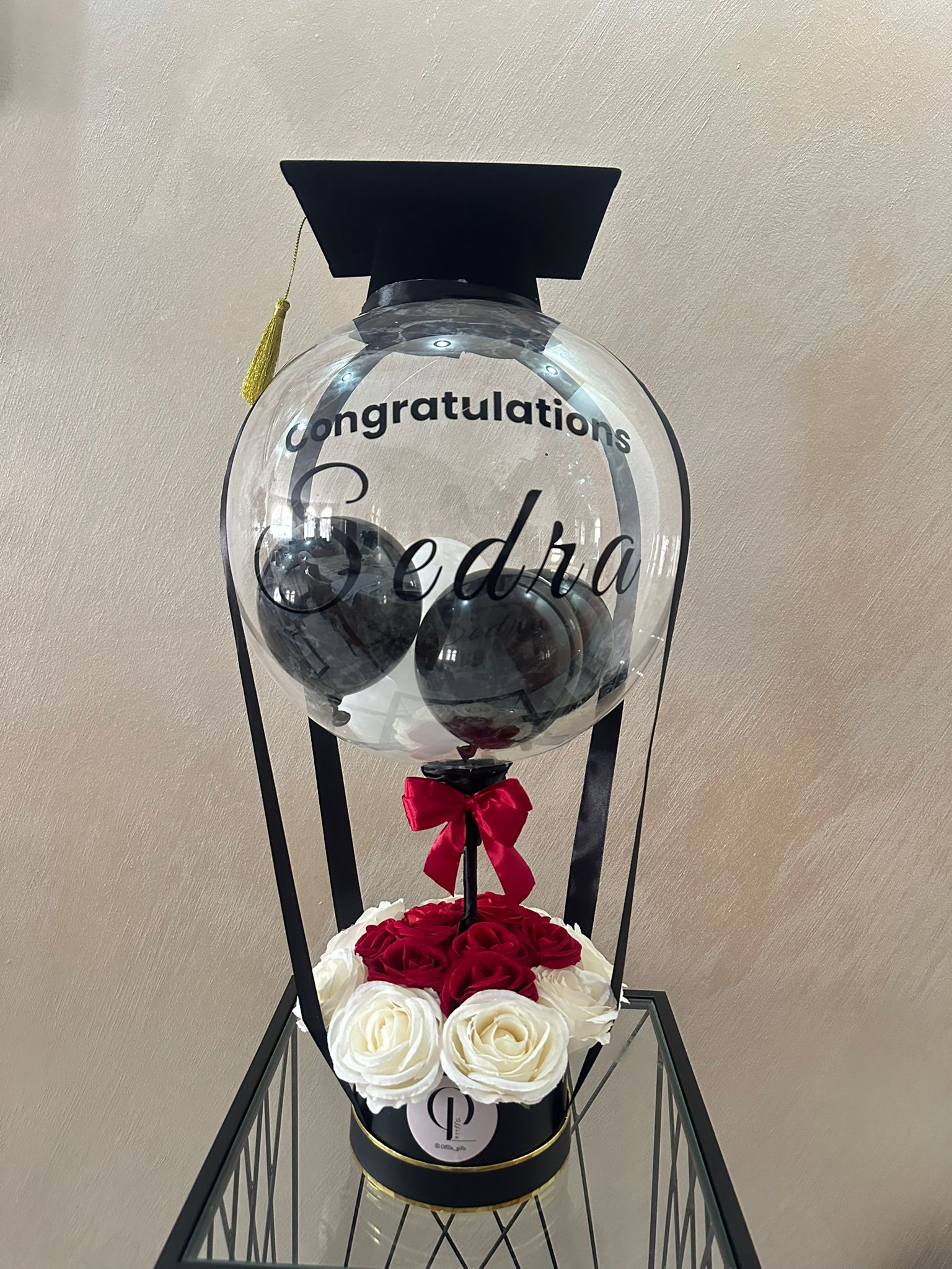 بالون شفاف مع قبعة التخرج، مزين بورود بتنسيق أنيق جدًا، وداخله بالونات ملائمة لالوان الورد اللي بتعطيها لمسة راقية ومميزة