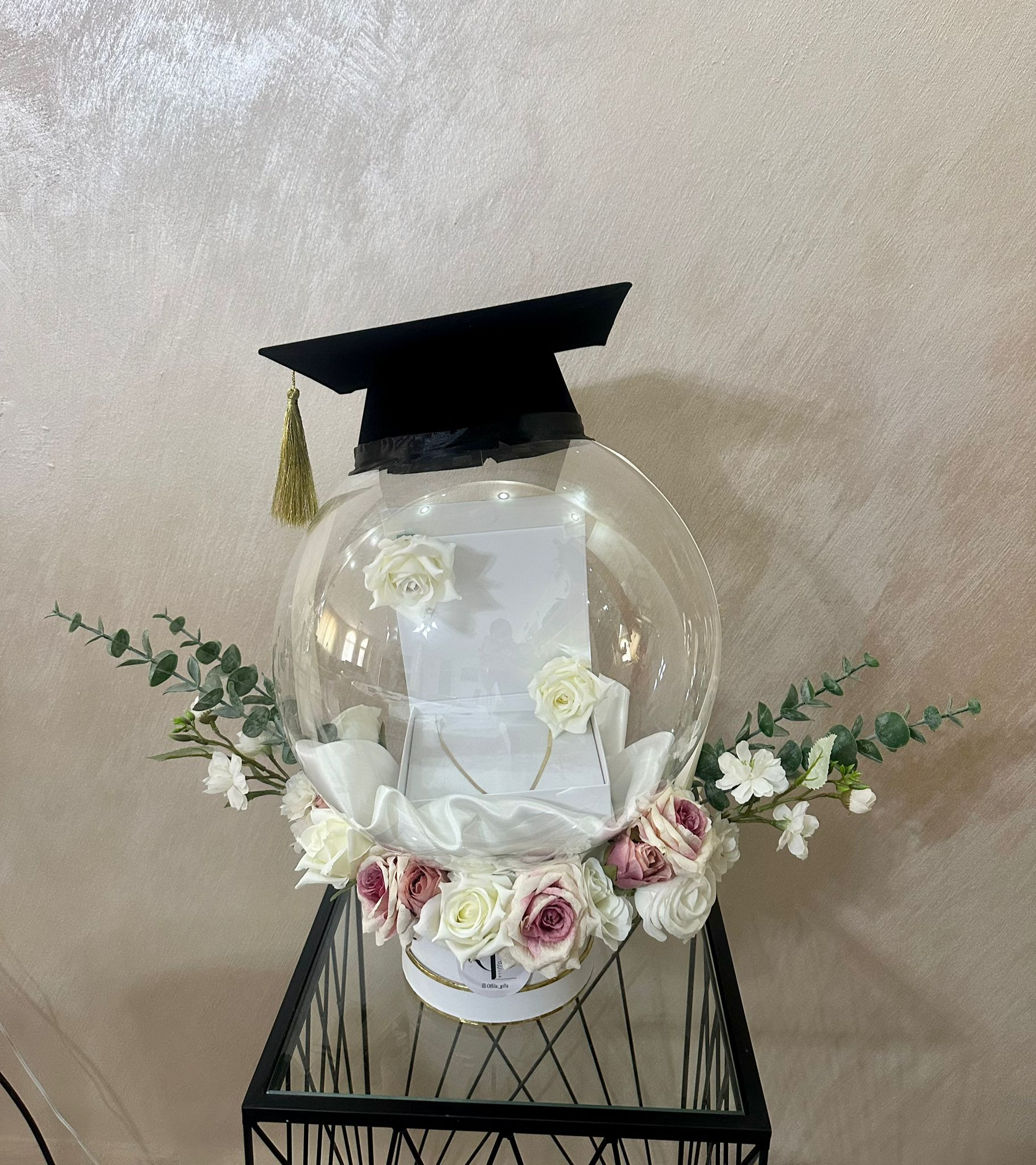بالون شفاف مزين بوردات ناعمة بلون أبيض وزهري، وعليه قبعة تخرج أنيقة