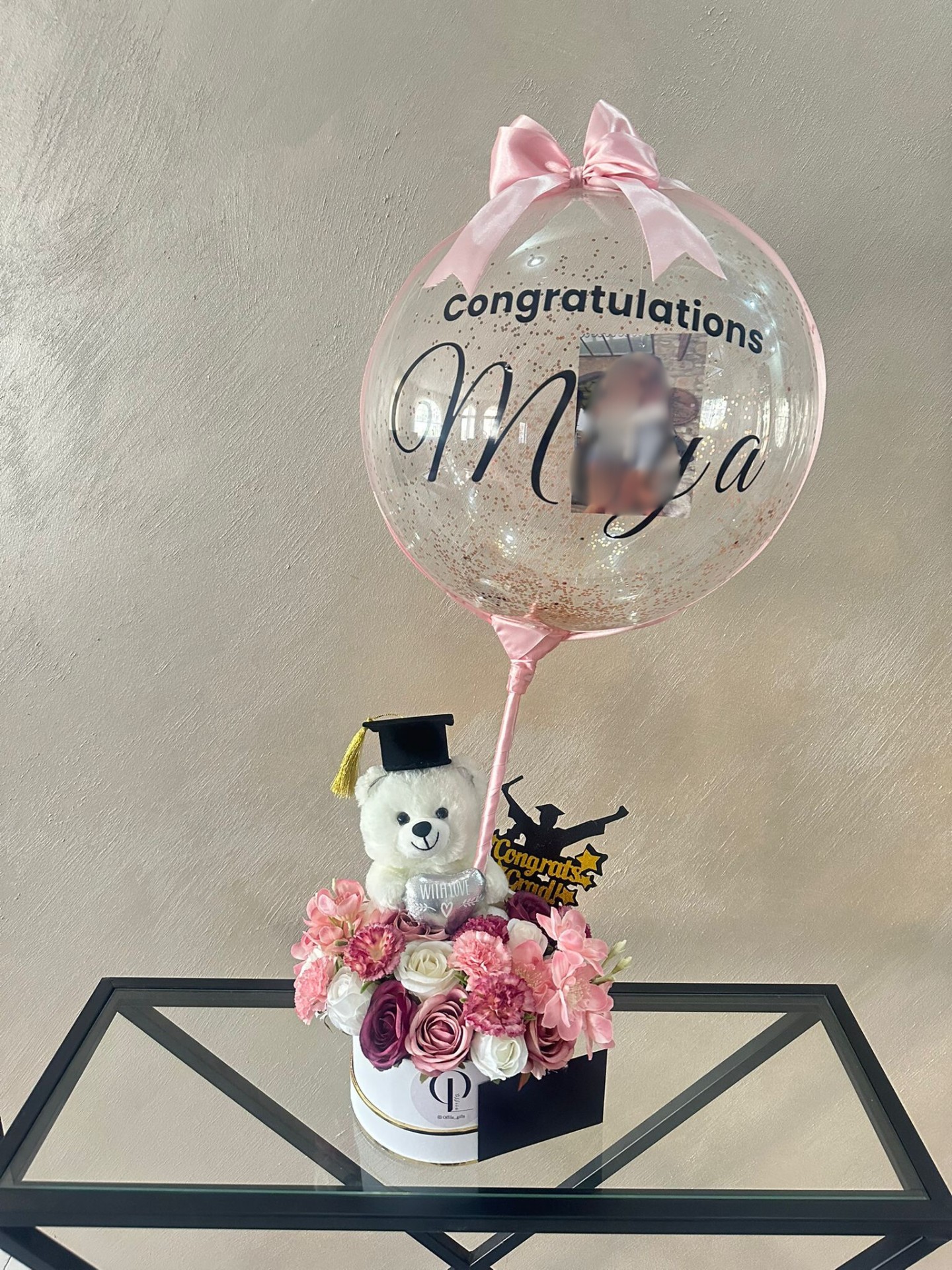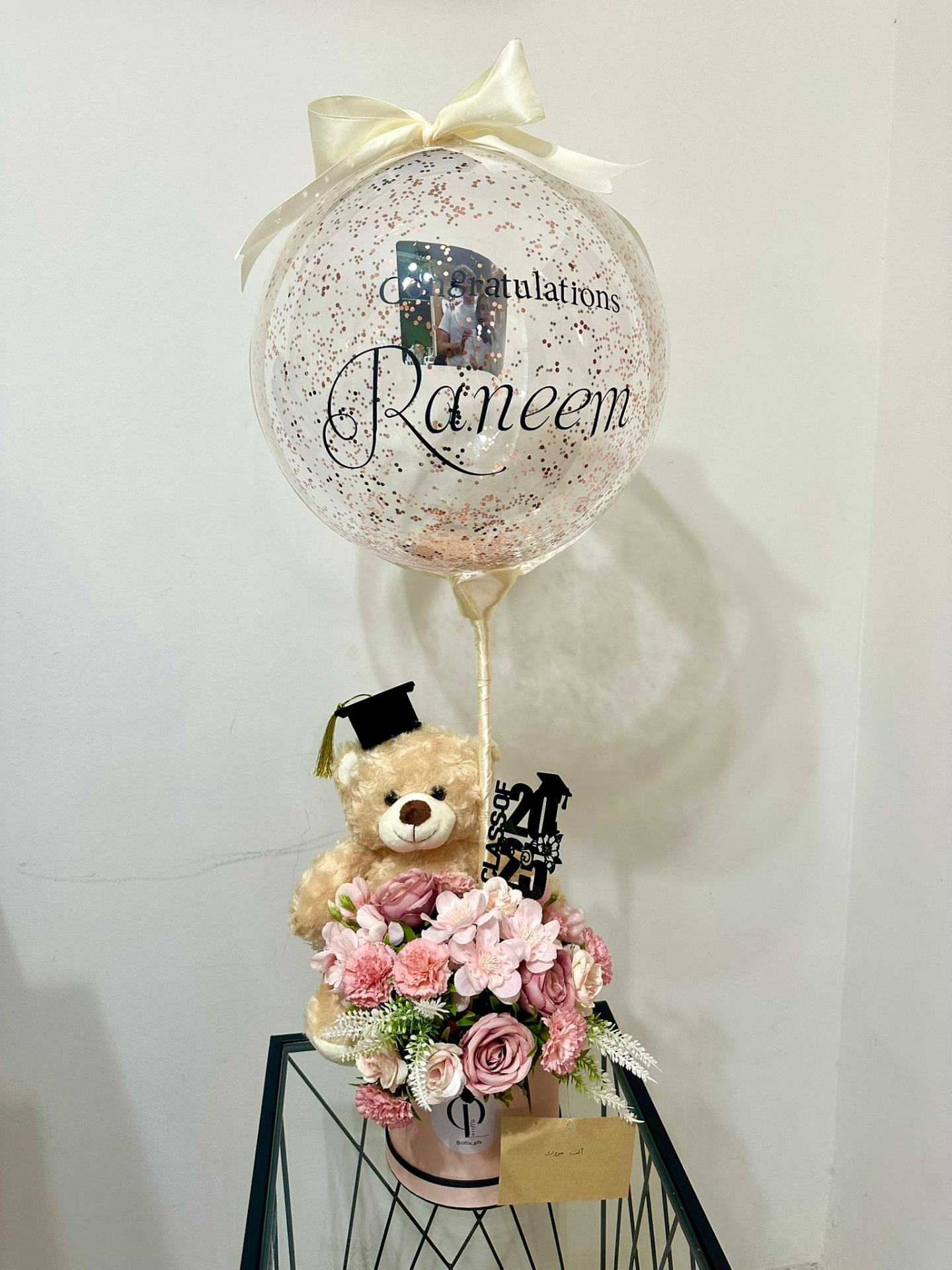 هدية جدًّا مميزة تتضمن ضمة ورد اصطناعي، دبدوب، بالون شفاف بداخله برق أو بالونات صغيرة وكتابة من إختيارك على البالون